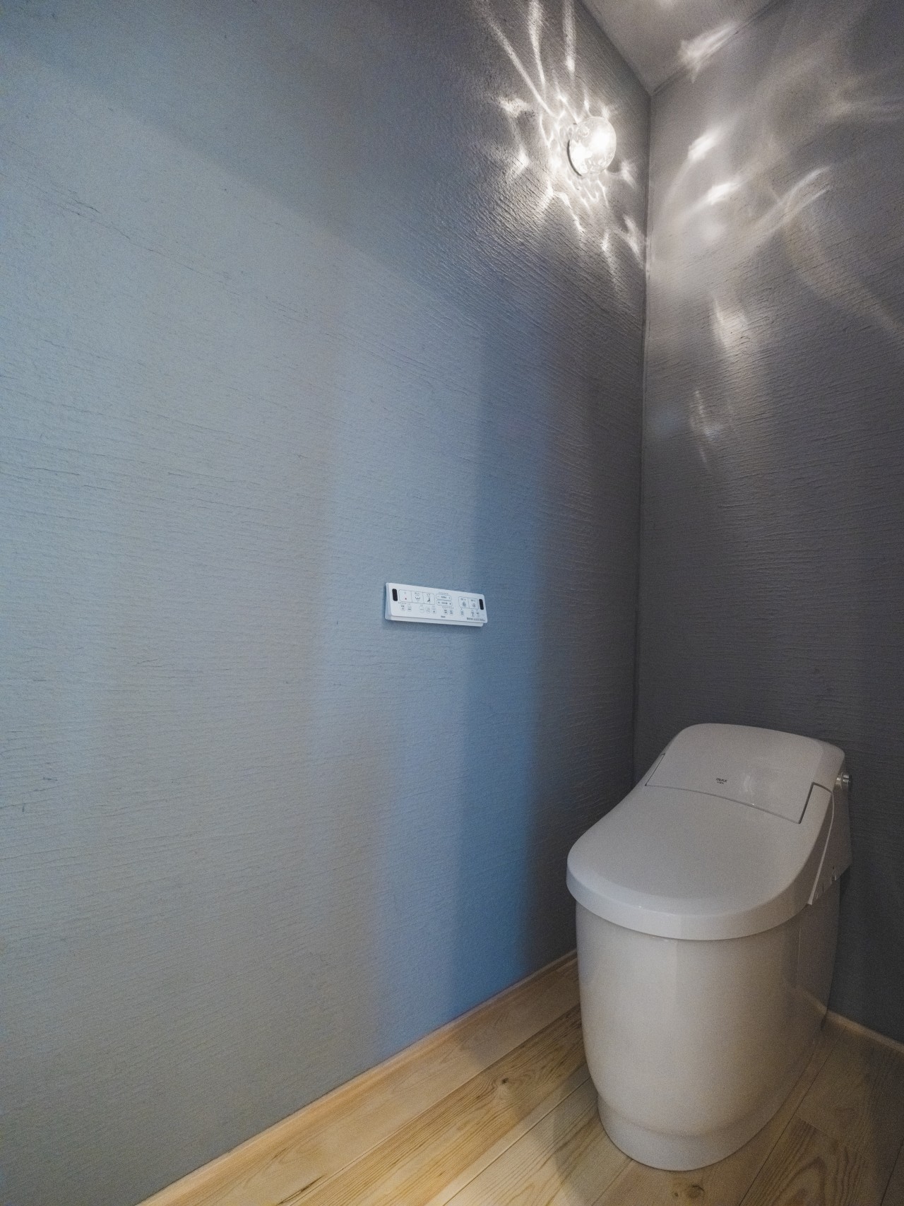 • グレー漆喰の壁に包まれたトイレ。