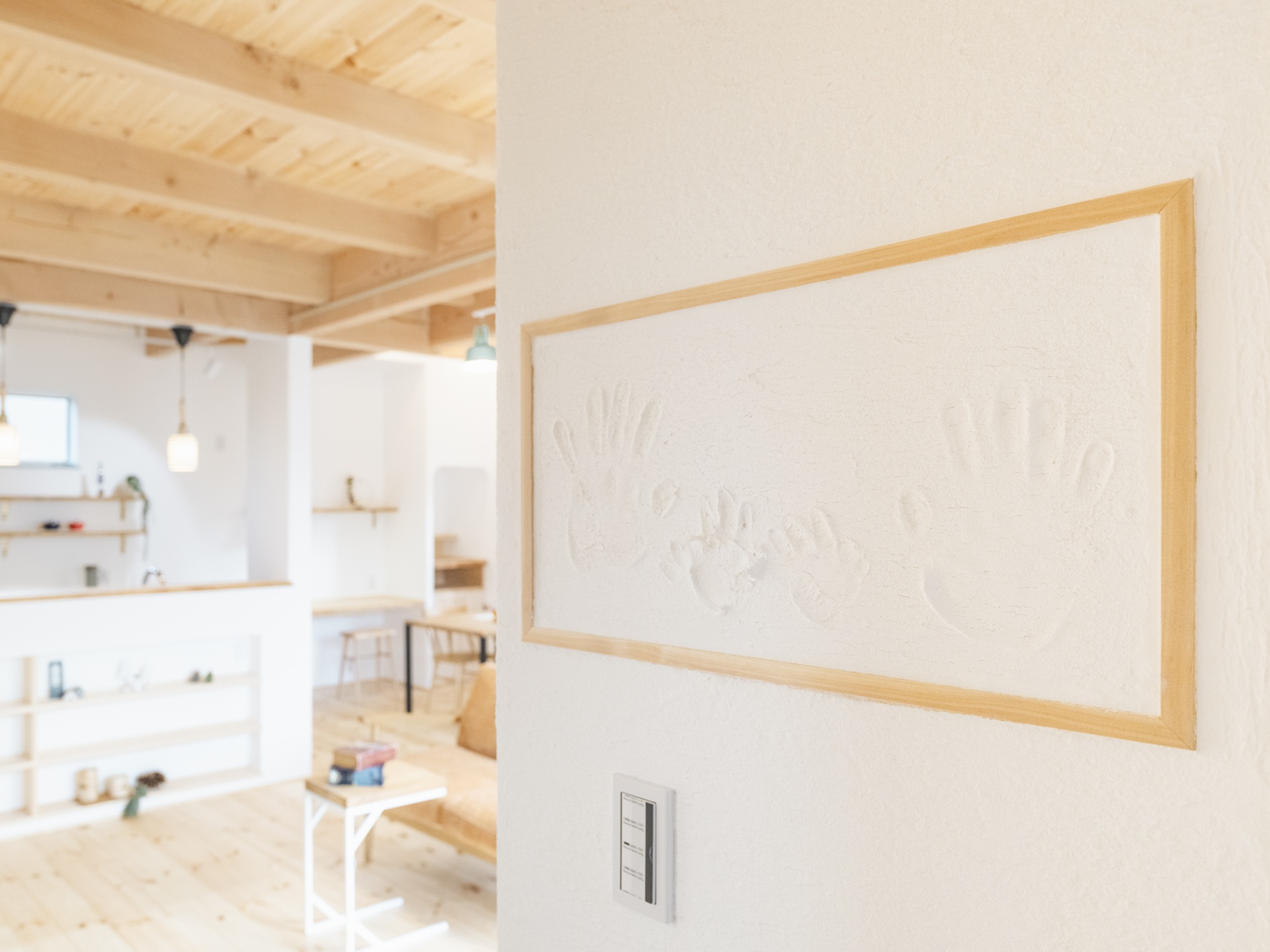 リビング入口の漆喰壁には、家族の手形を残しました。