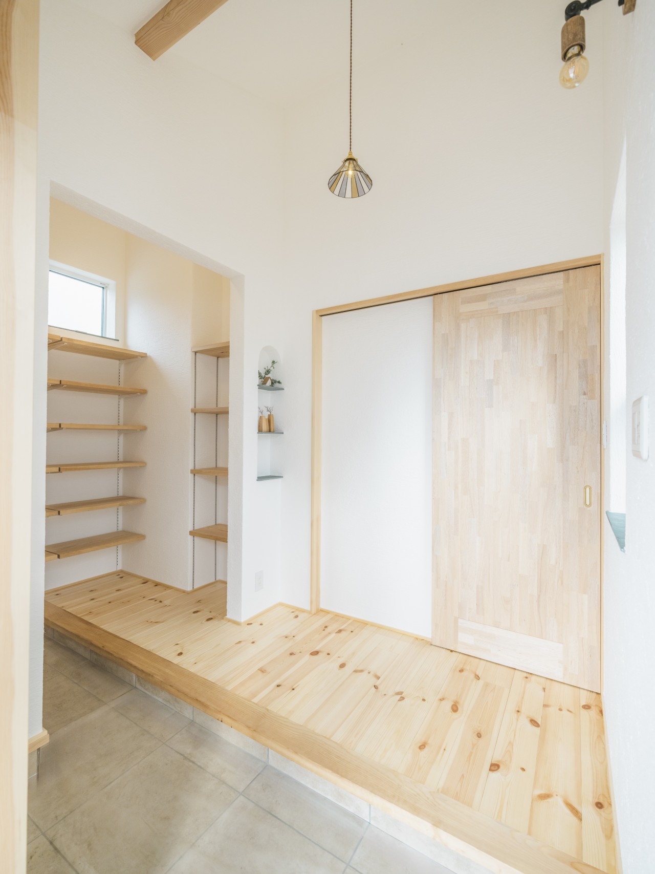 壁面にはニッチを設け、季節の小物やお気に入りを飾れる“迎えの空間”に仕上げました。 -